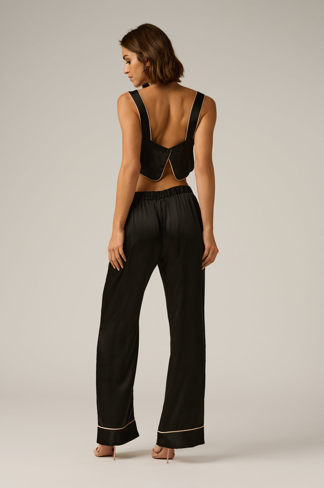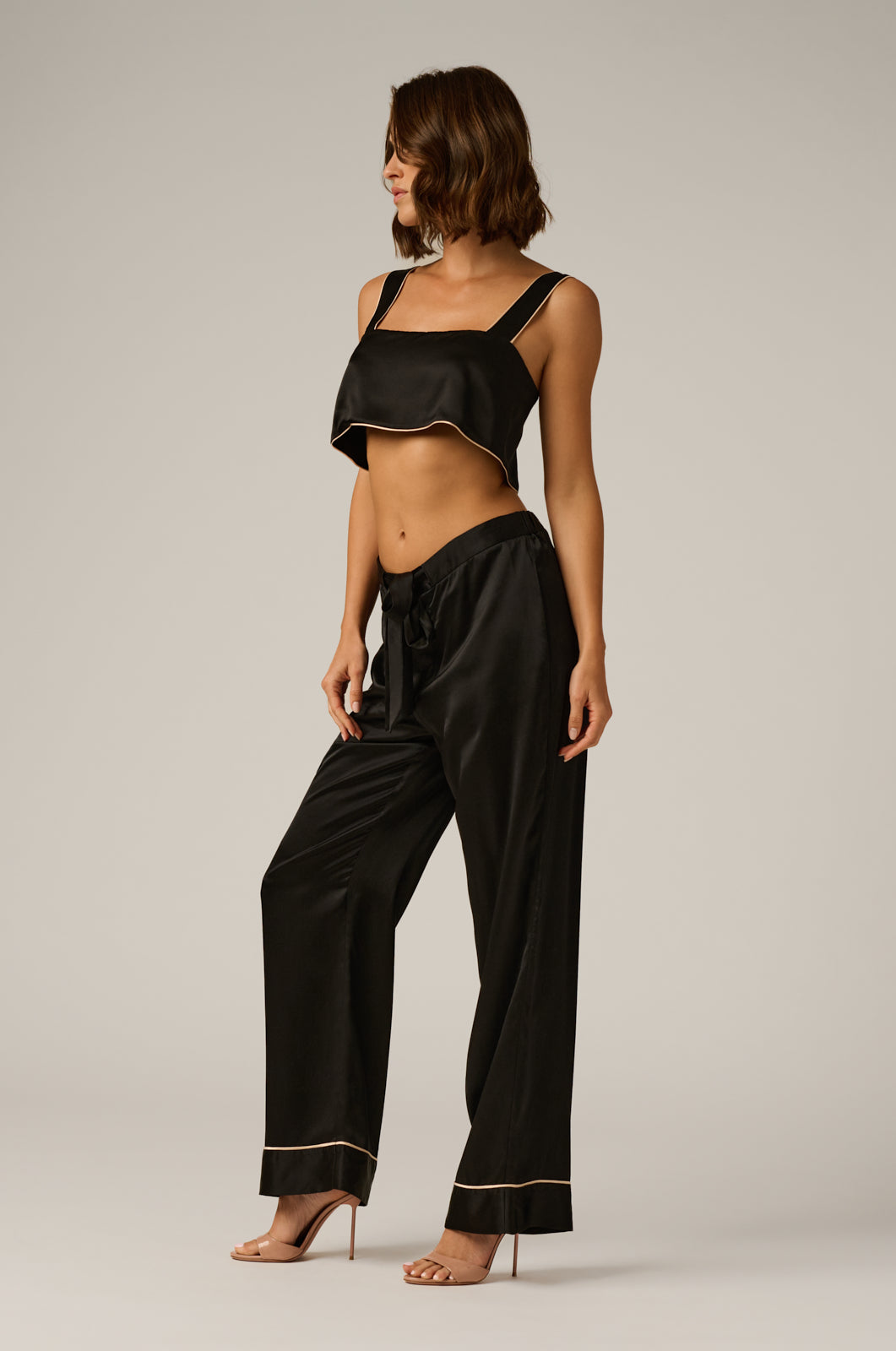 Made from lustrous Silk Charmeuse, the KIKI Silk Lounge Bandeau Top, pairs PJ-inspired piping with a modern and feminine cropped shape. Pair it with its matching Tap Short, Tie-up Pant or high-waist denim.