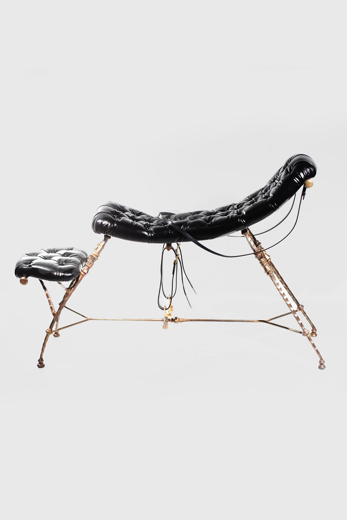 Featured in the Kiki de Montparnasse Showroom, The Chaise Boudoir is now available as a showcase piece for our clients. Designed by master furniture and lighting designer Mark Brazier, our signature Chaise Boudoir is crafted from brass and tufted black leather and is sure to add a timeless intrigue and sense of adventure to any space.