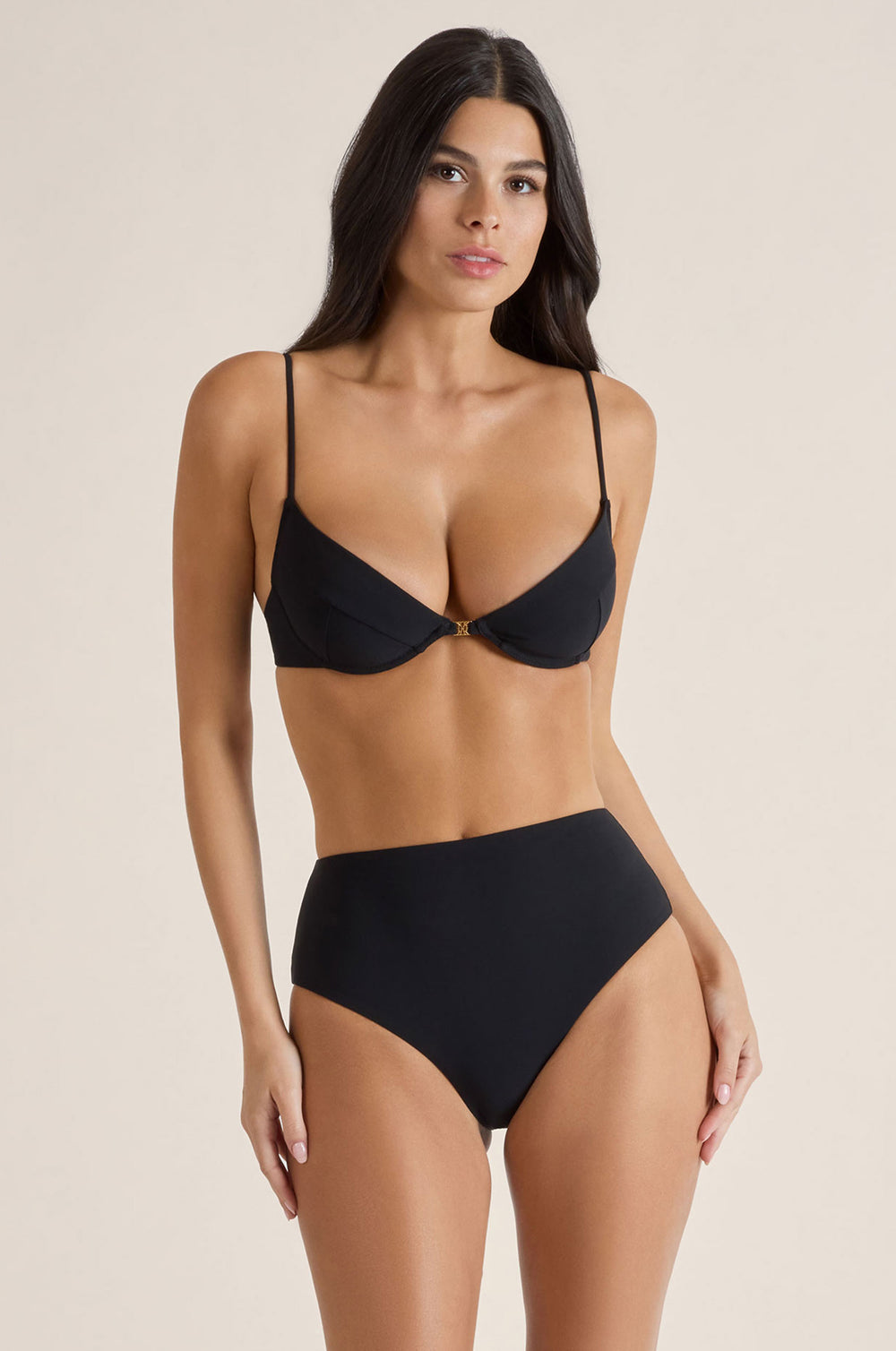 Designed for a sculpted fit, this paneled demi bikini top offers ultimate shape and support. Featuring a gold Kiki insignia at the center, sleek adjustable straps, and a looped back tie for a secure, custom fit. Pair with our Lace-Up High Waist Bikini Bottom for a coordinated look.