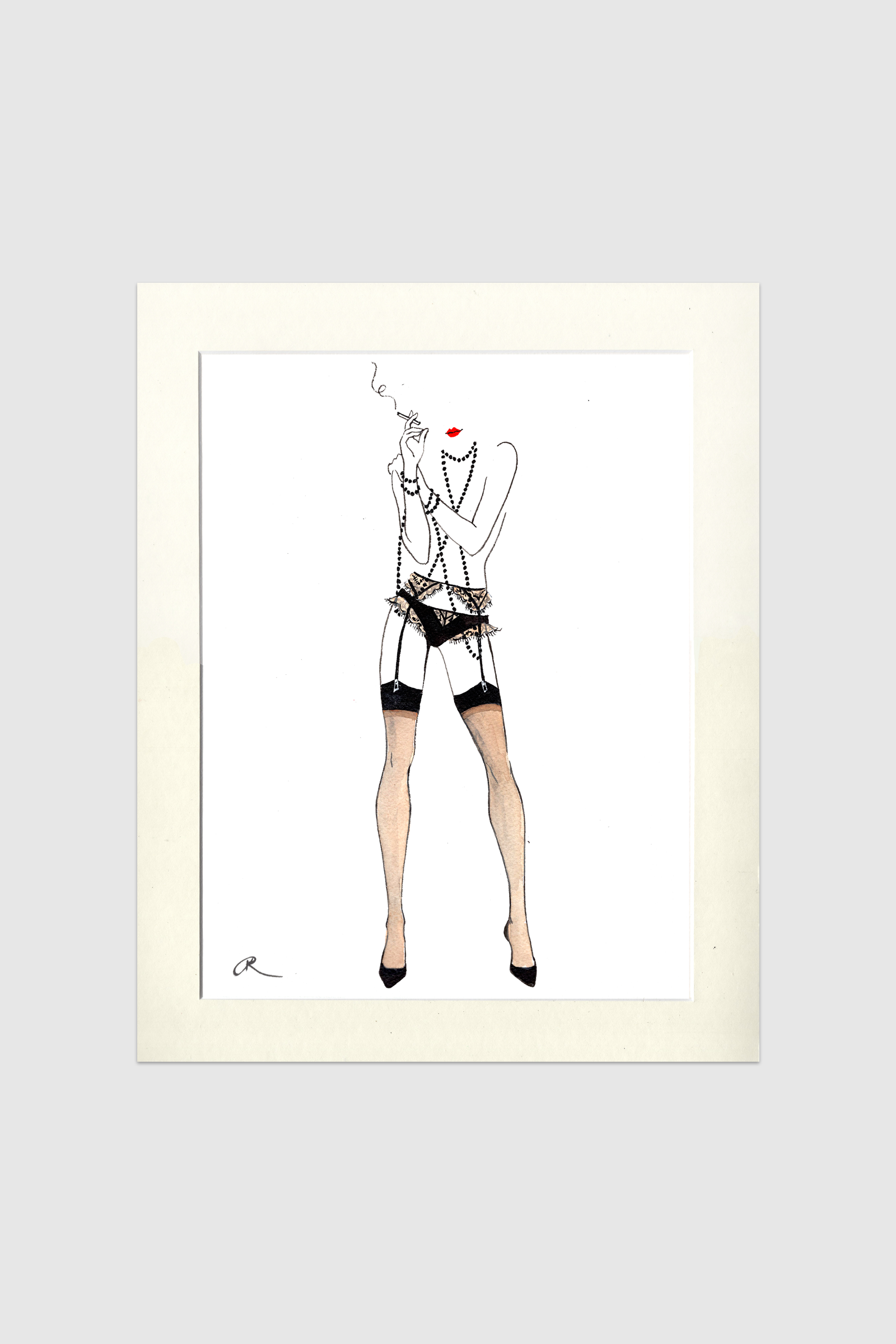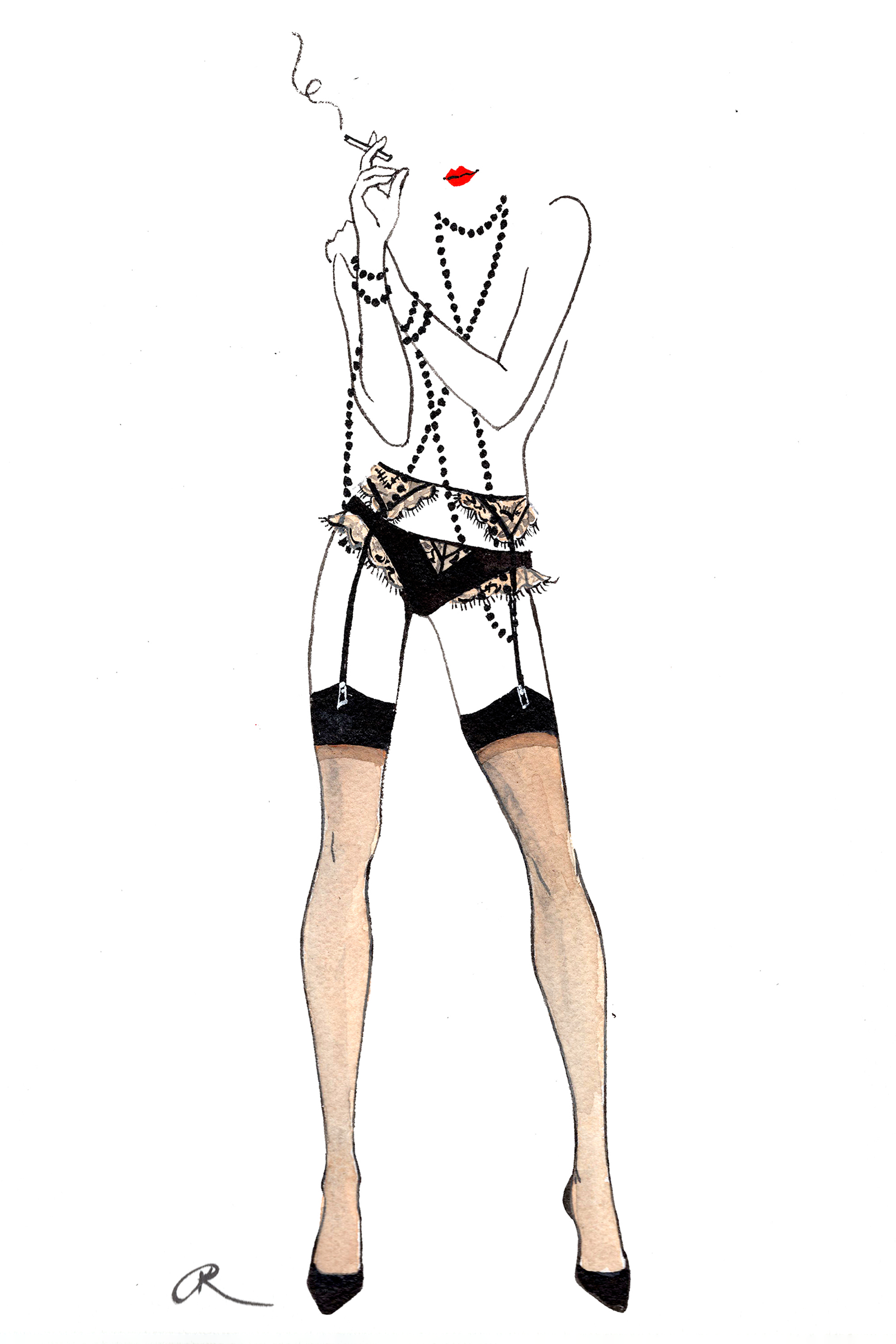 Regina Yazdi has created sketches and paintings for an illustrious clientele that includes Chanel, Dior, Bulgari, Harry Winston, and CR Magazine. For Holiday, she's turned her gaze and hand to the world of KIKI DE MONTPARNASSE with a trio of limited edition, original gouache on paper that feature iconic KIKIDM styles. 'L'amour Fou', the fiery love, depicts the quintessential KIKIGIRL in our Faceted Onyx Restraints, Lace Inset Garter Belt, and Thong.